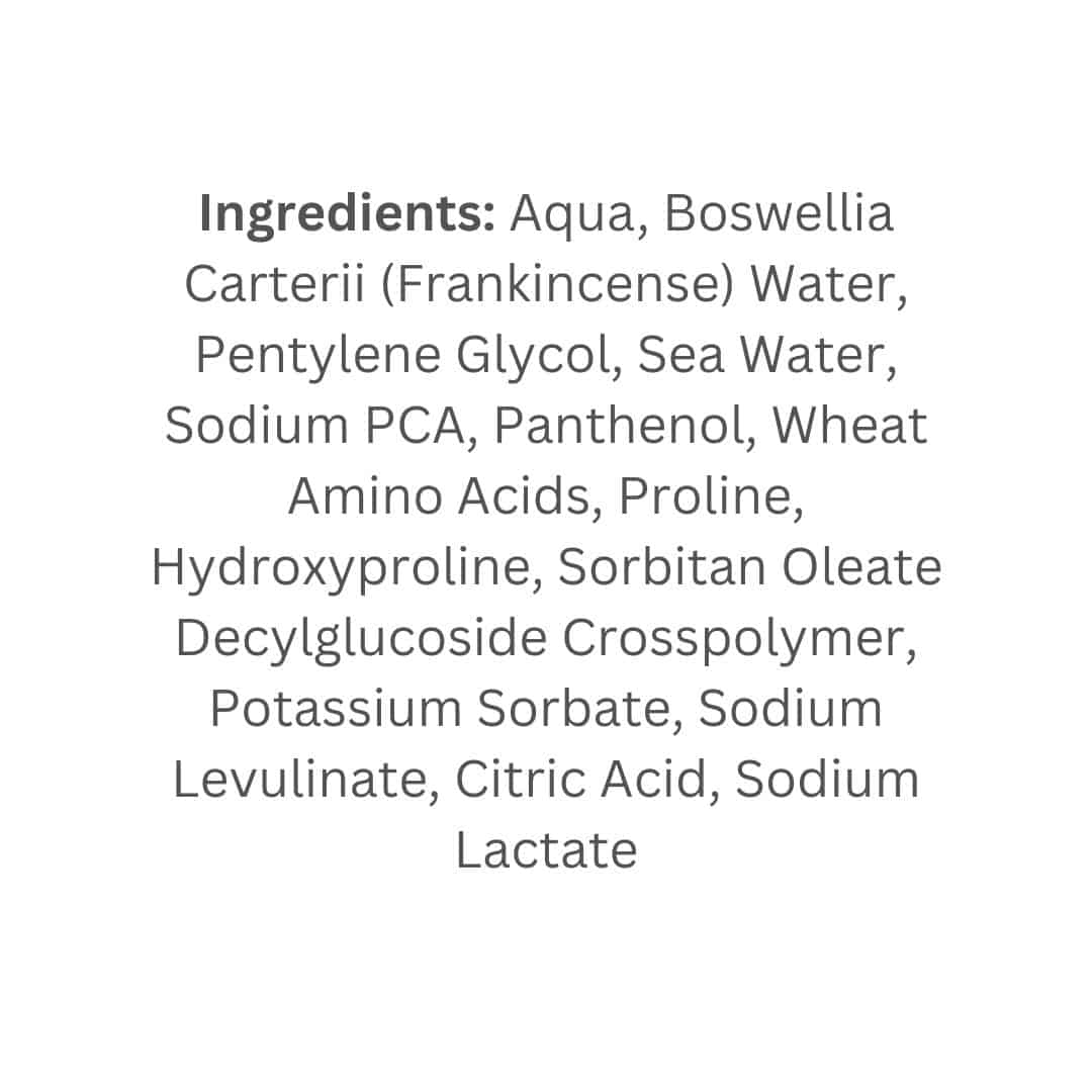 Aqua, Boswellia Carterii (Frankincense) Water, Pentylene Glycol, Sea Water, Sodium PCA, Panthenol, Wheat Amino Acids, Proline, Hydroxyproline, Sorbitan Oleate Decylglucoside Crosspolymer, Potassium Sorbate, Sodium Levulinate, Citric Acid, Sodium Lactate