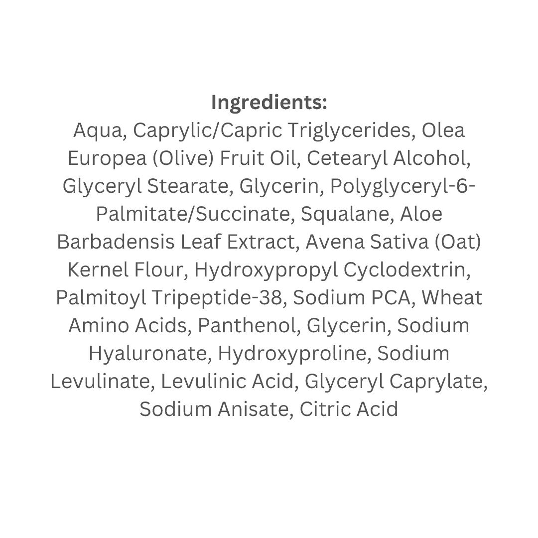 Aqua, Caprylic/Capric Triglycerides, Olea Europea (Olive) Fruit Oil, Cetearyl Alcohol, Glyceryl Stearate, Glycerin, Polyglyceryl-6-Palmitate/Succinate, Squalane, Aloe Barbadensis Leaf Extract, Avena Sativa (Oat) Kernel Flour, Hydroxypropyl Cyclodextrin, Palmitoyl Tripeptide-38, Sodium PCA, Wheat Amino Acids, Panthenol, Glycerin, Sodium Hyaluronate, Hydroxyproline, Sodium Levulinate, Levulinic Acid, Glyceryl Caprylate, Sodium Anisate, Citric Acid
