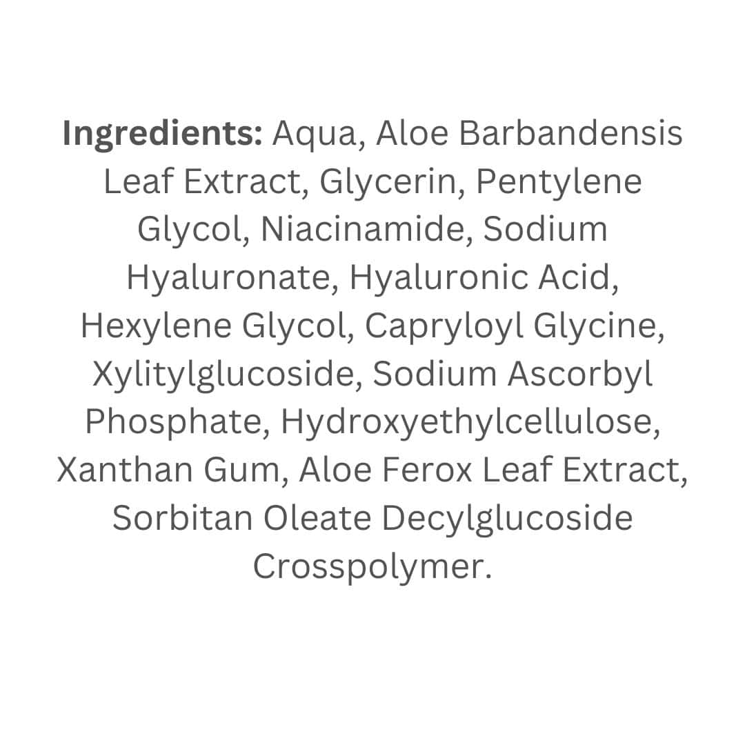 Aqua, Aloe Barbandensis Leaf Extract, Glycerin, Pentylene Glycol, Niacinamide, Sodium Hyaluronate, Hyaluronic Acid, Hexylene Glycol, Capryloyl Glycine, Xylitylglucoside, Sodium Ascorbyl Phosphate, Hydroxyethylcellulose, Xanthan Gum, Aloe Ferox Leaf Extract, Sorbitan Oleate Decylglucoside Crosspolymer.