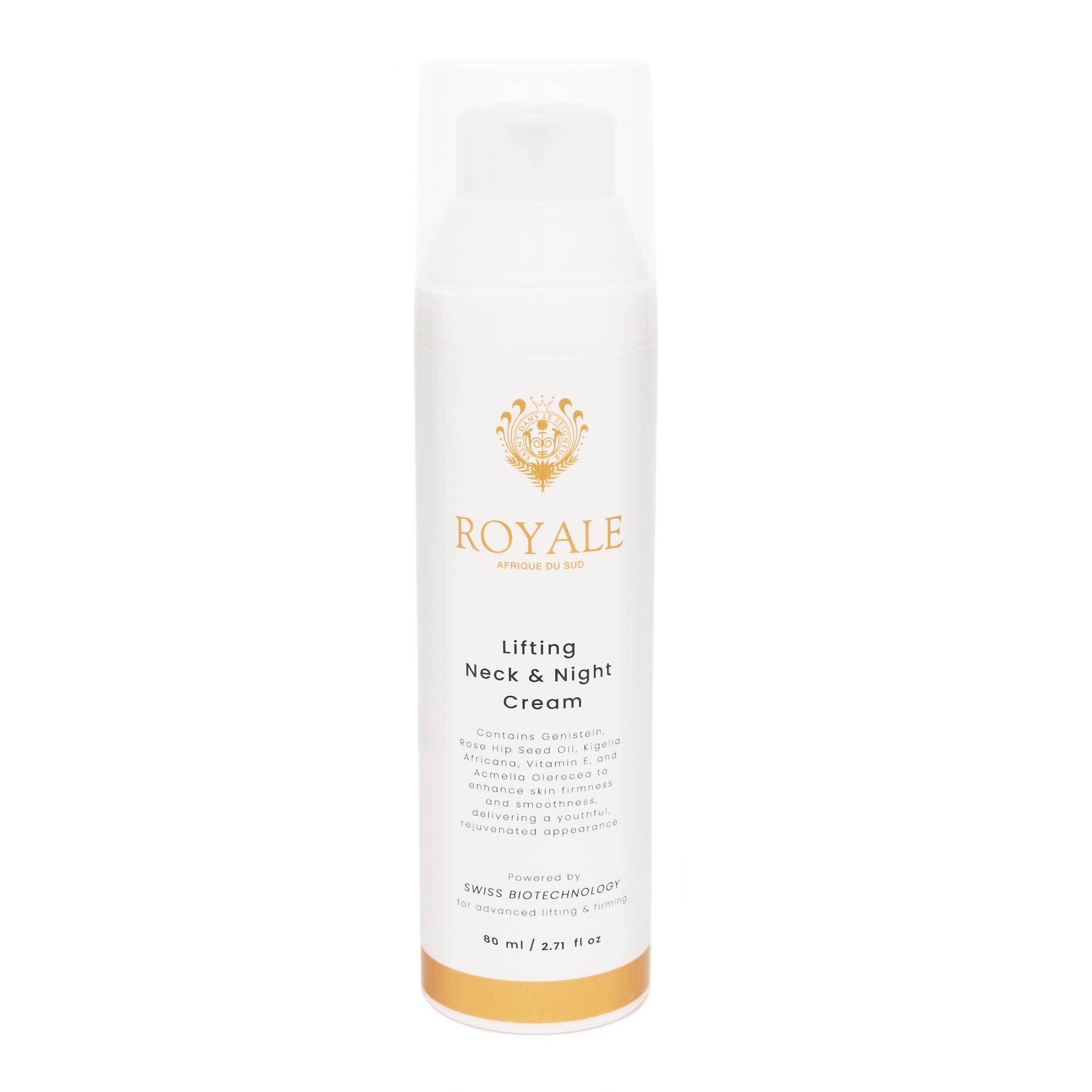 Experience the transformative power of ROYALE Lifting Neck & Night Cream, a luxurious multi-purpose moisturizer designed to deeply hydrate, firm, and nourish your skin overnight. This advanced formula works harmoniously to rejuvenate the delicate neck and décolletage area while providing intensive nourishment to your face as you sleep.