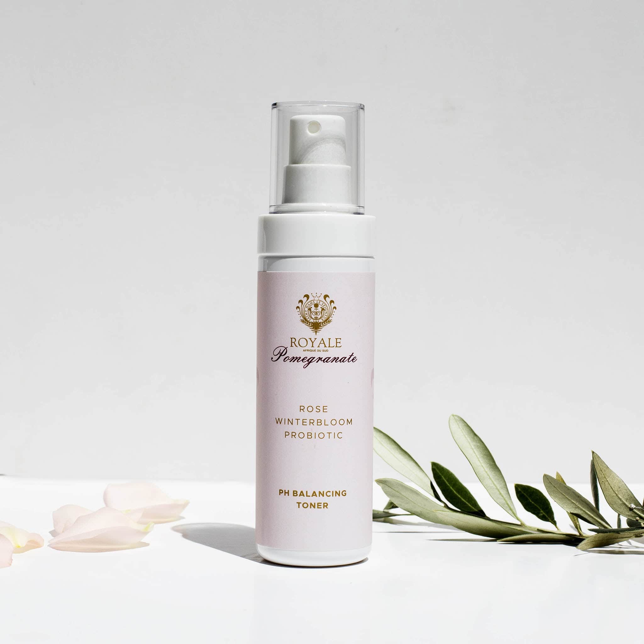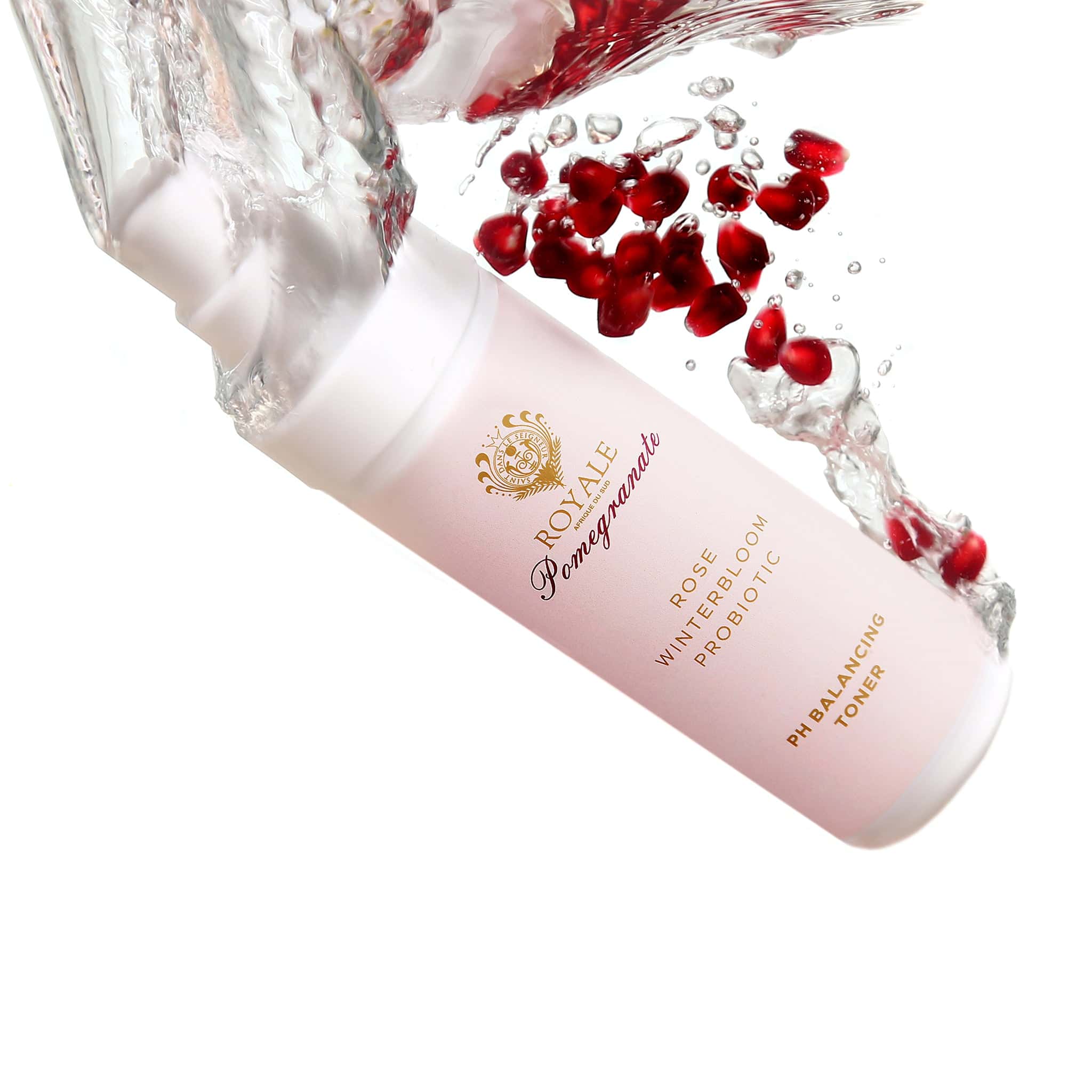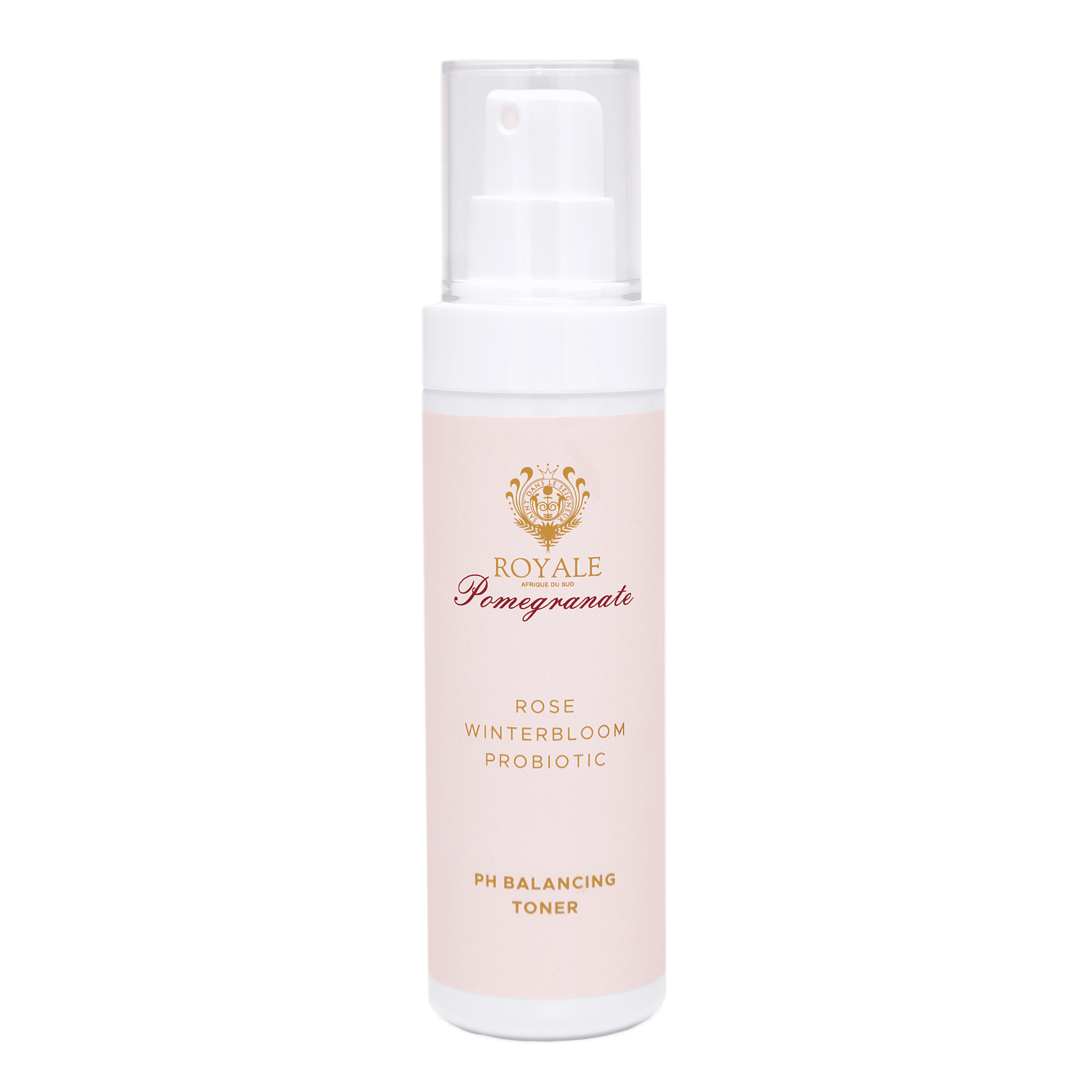 Royale Pomegranate PH Balancing Toner is a natural formulation with hydrating rose hydrosol, cleansing winter bloom (witch hazel), pomegranate peel extract and PH balancing probiotics.