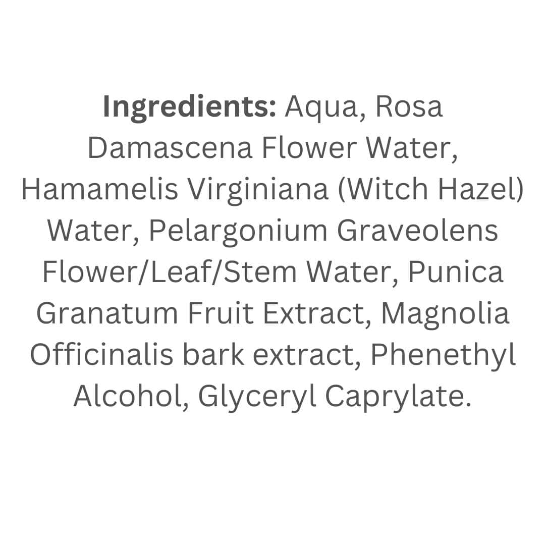 Aqua, Rosa Damascena Flower Water, Hamamelis Virginiana (Witch Hazel) Water, Pelargonium Graveolens Flower/Leaf/Stem Water, Punica Granatum Fruit Extract, Aqua, Rosa Damascena Flower Water, Hamamelis Virginiana (Witch Hazel) Water, Pelargonium Graveolens Flower/Leaf/Stem Water, Punica Granatum Fruit Extract, Magnolia Officinalis bark extract, Phenethyl Alcohol, Glyceryl Caprylate.