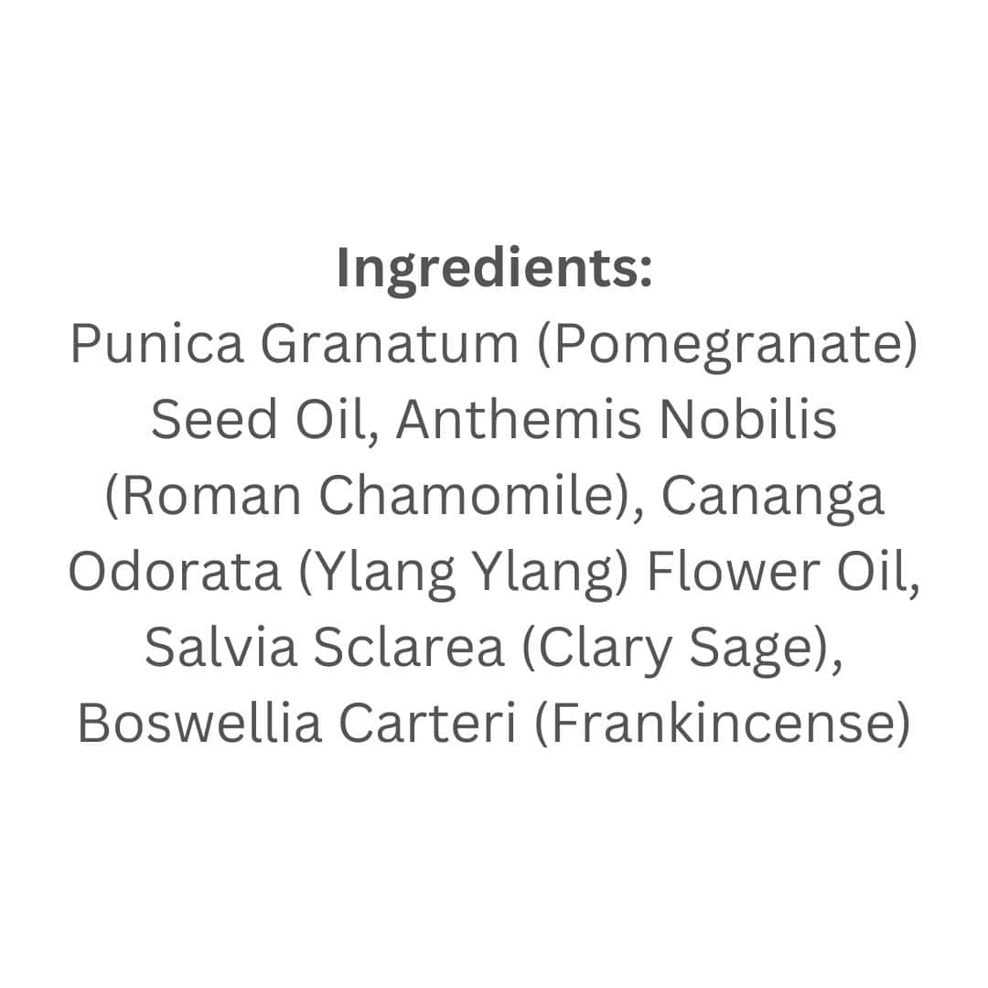 Punica Granatum (Pomegranate) Seed Oil, Anthemis Nobilis (Roman Chamomile), Cananga Odorata (Ylang Ylang) Flower Oil, Salvia Sclarea (Clary Sage), Boswellia Carteri (Frankincense), Rosemarinus Officinalis Leaf Extract, Rapeseed oil.